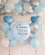 2 фонтана по 10 шаров с сердцами с вашими надписями, большой волшебный шар баблс с вашей надписью, 15 шаров в потолок.