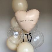 Сердце с надписью (можно исполнить любую), 5 обычных латексных шаров, 4 шара с пенопластовыми шариками, атласные ленты, грузик.