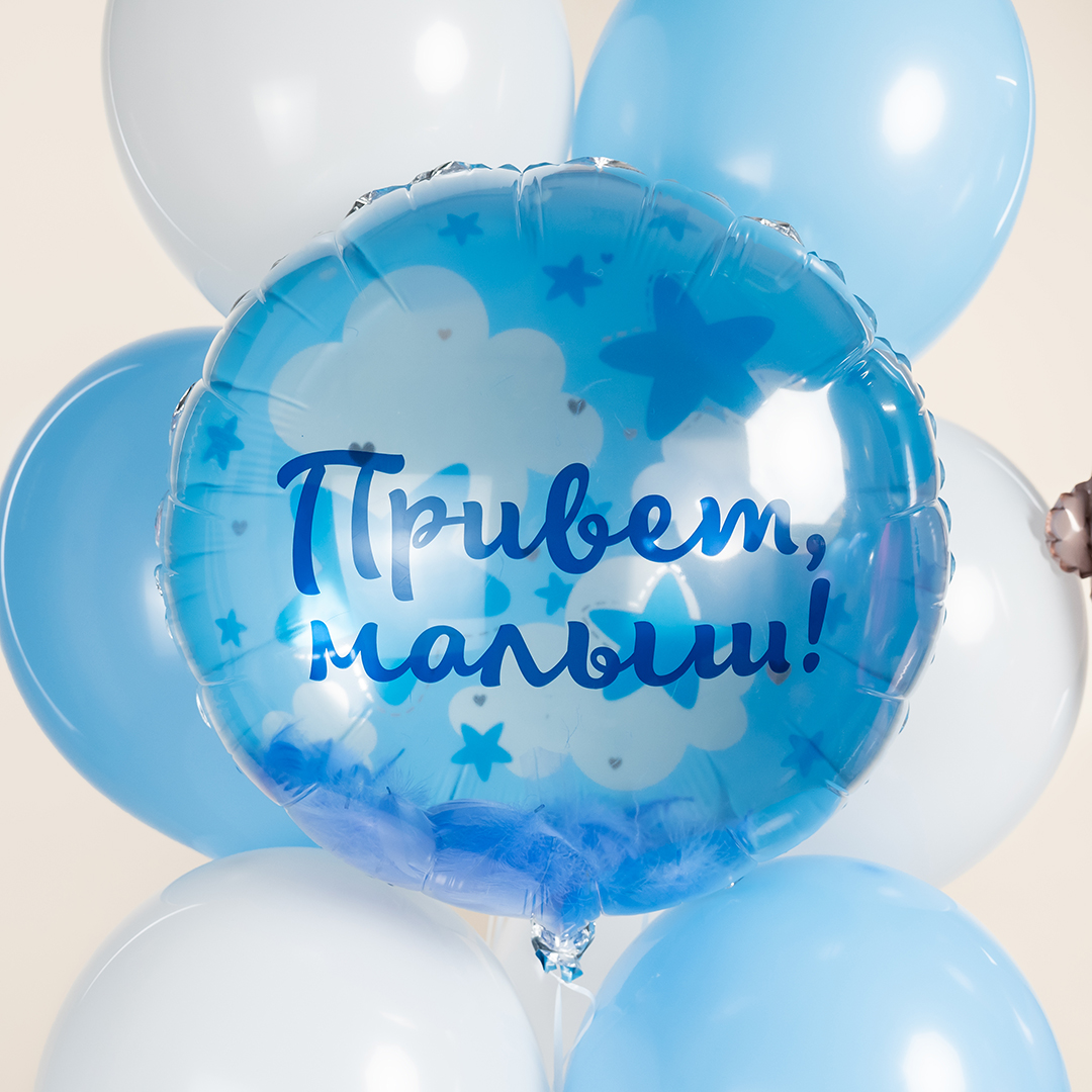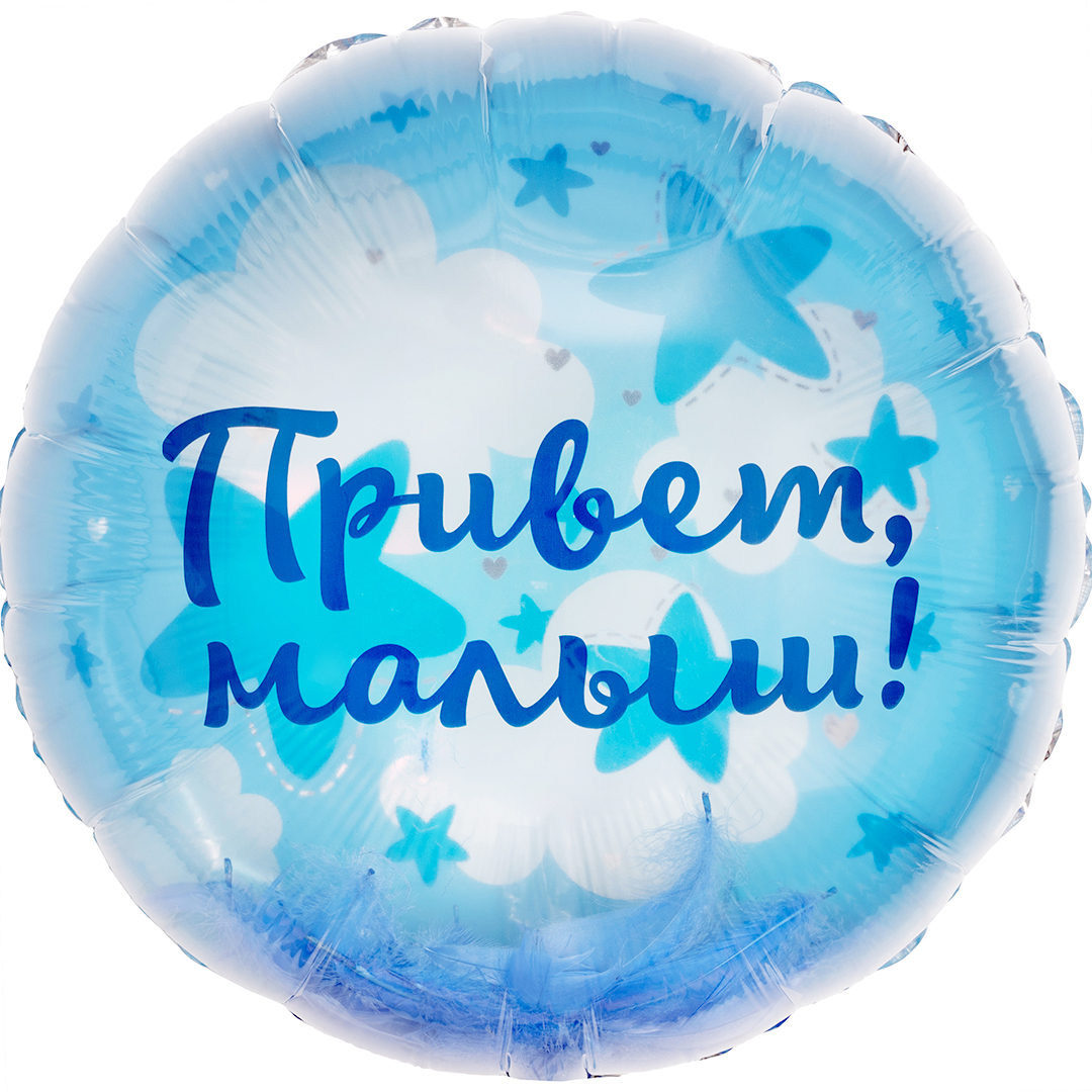 Прозрачный шар с перьями на выписку мальчика фольгированный с гелием Привет, малыш!
