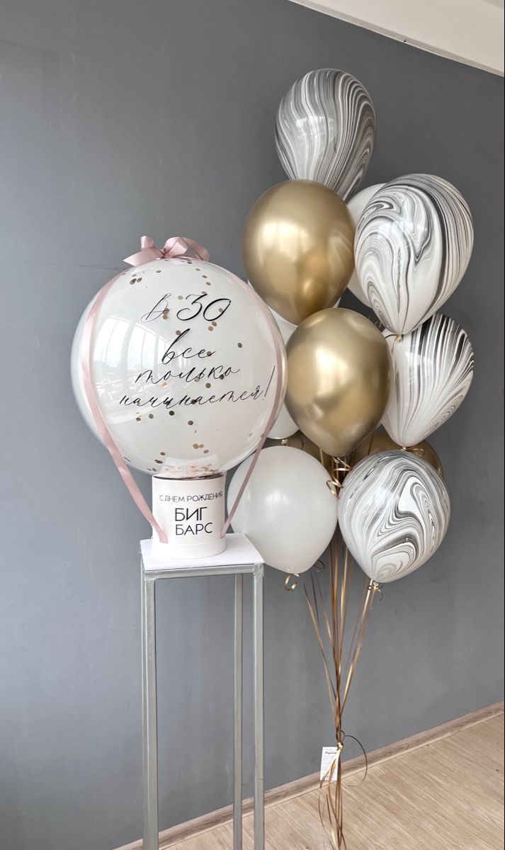 Большой шар: развязать ленты, он взлетит, и вместе с ним из коробочки вылетят купюры или фото на специальной ленте.