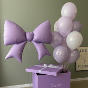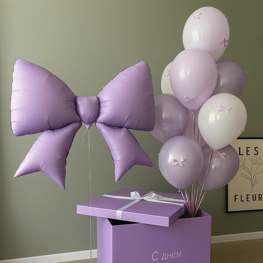 Сиреневая коробка с фольгированным бантом и фонтаном из шаров с гелием